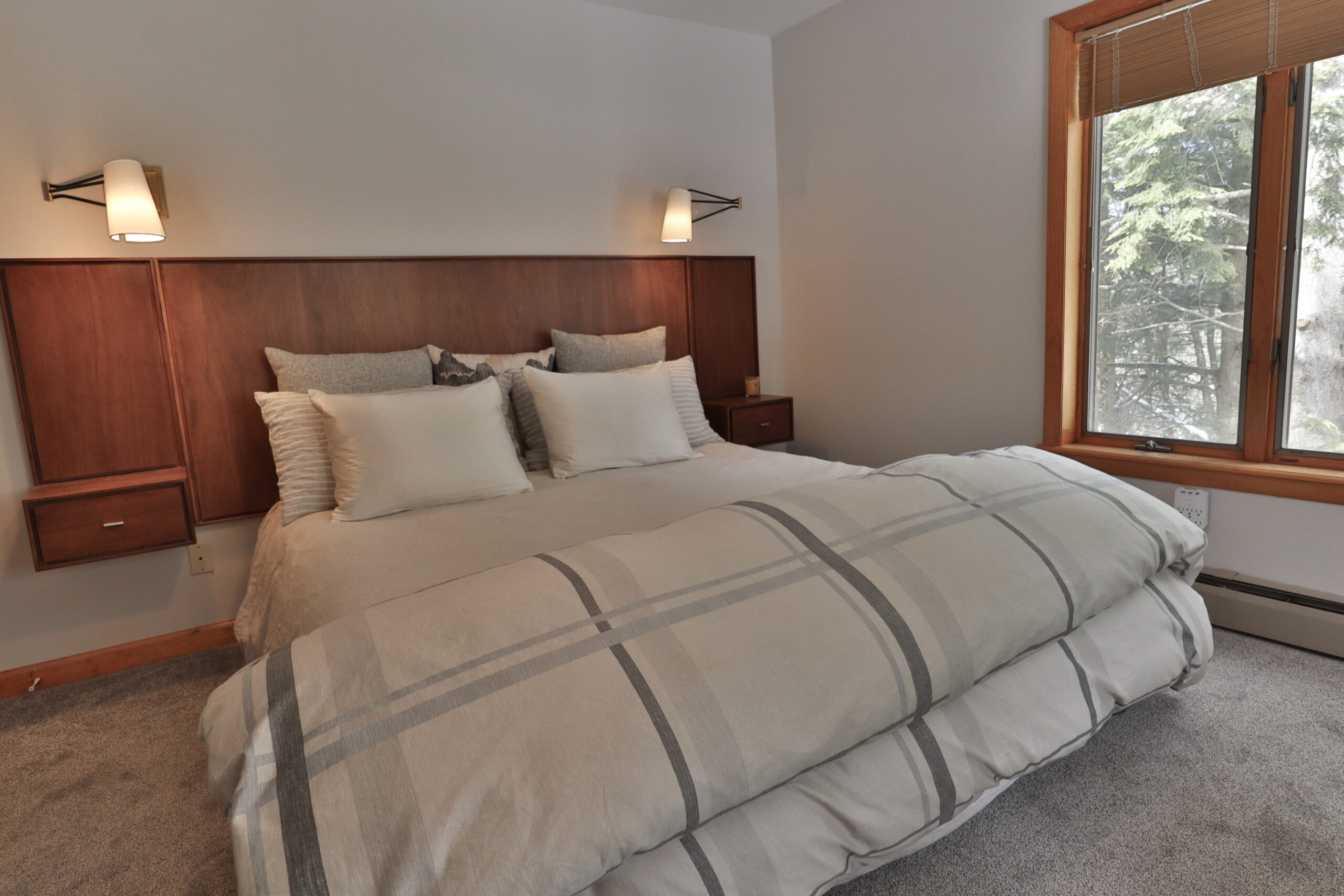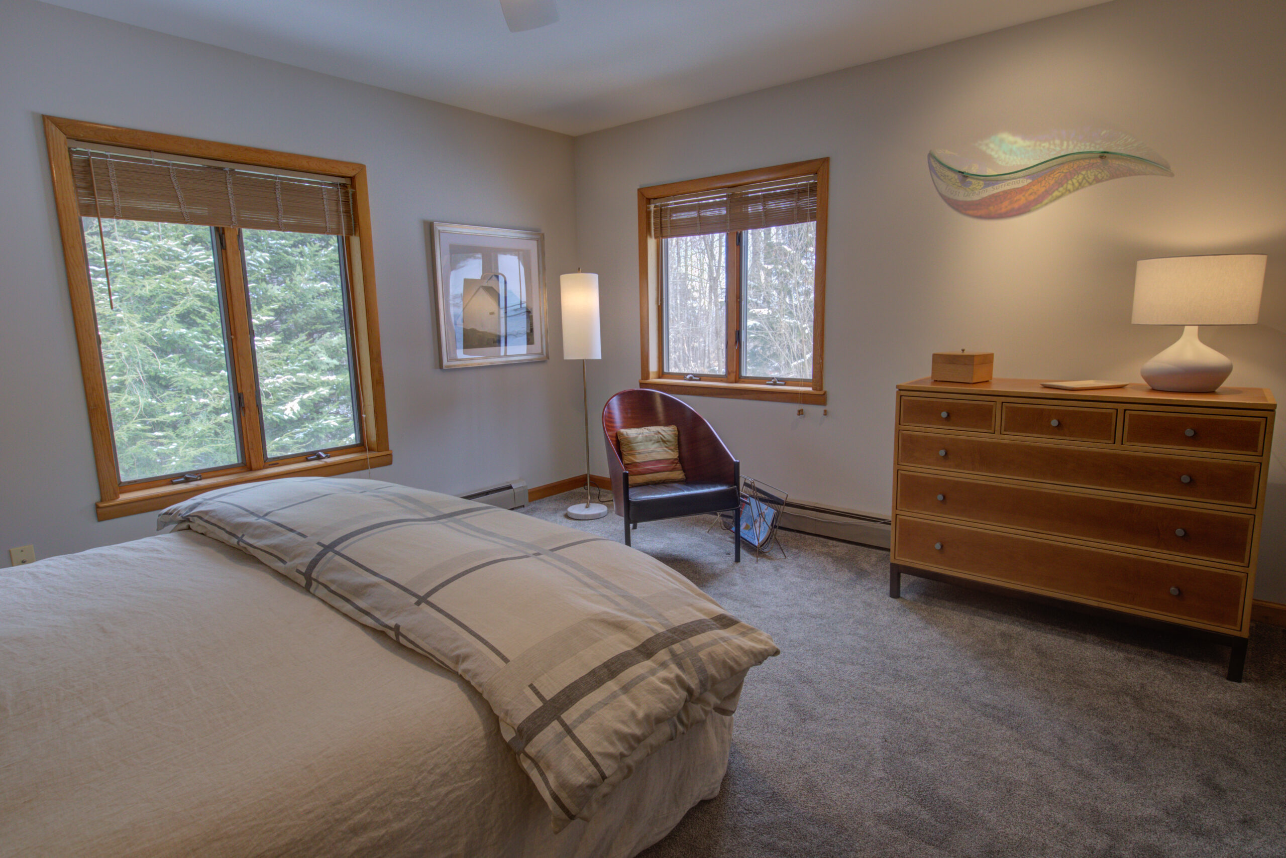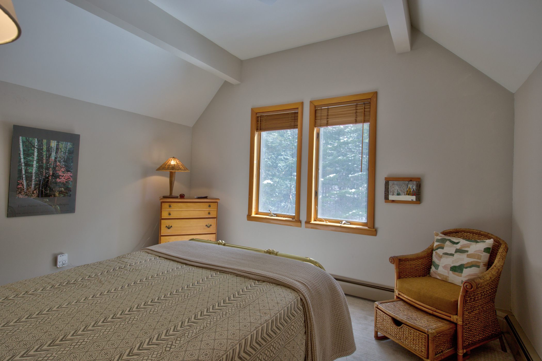 The main floor of our Stowe winter ski season rental home includes two comfy sofas centered on the wood burning fireplace, a corner desk, a generous reading chair at the window, a puzzle/card table, a corner bar, and a dining table that seats 8. The Lodge’s winter holiday kitchen has been updated with all new appliances including double ovens and a 5 burner stove and is fully stocked with cooking and baking tools and utensils. A laundry room is located just off the kitchen. The main floor also includes a King Bedroom Suite with a walk-in closet and bath with a tub and shower. Another bath with shower is located at the entry.