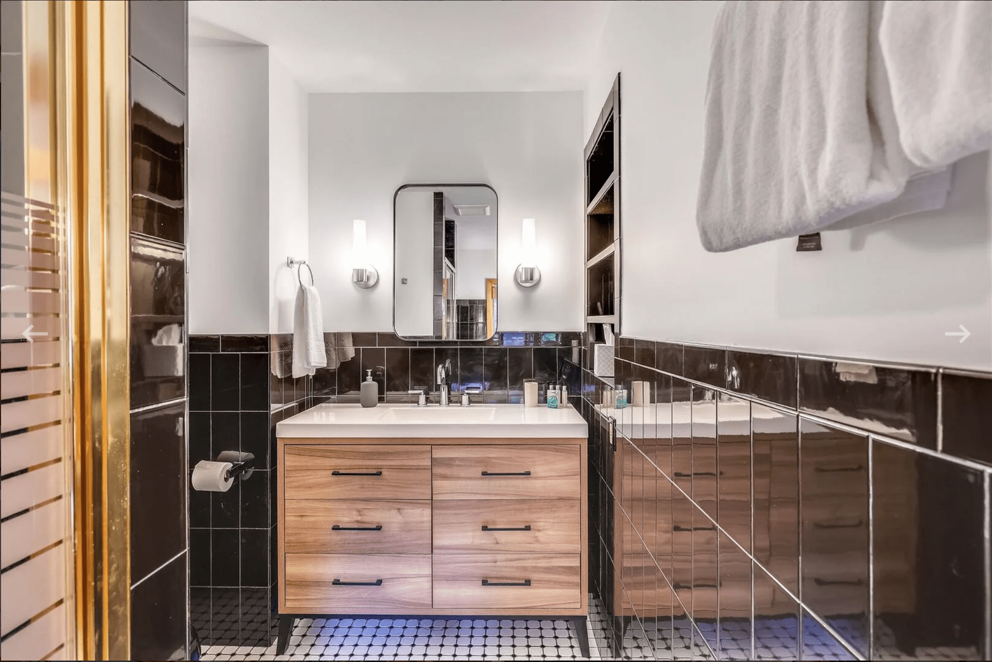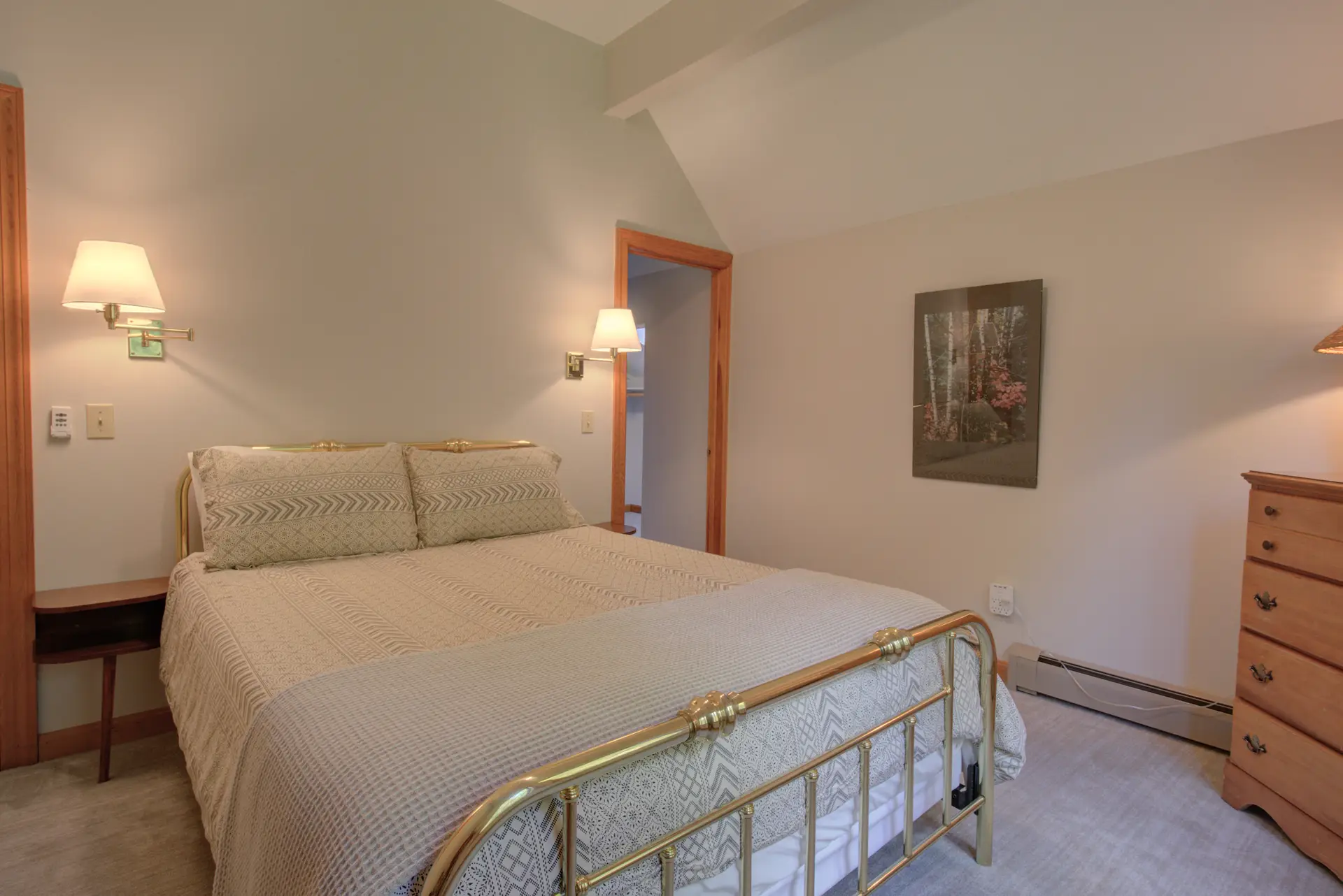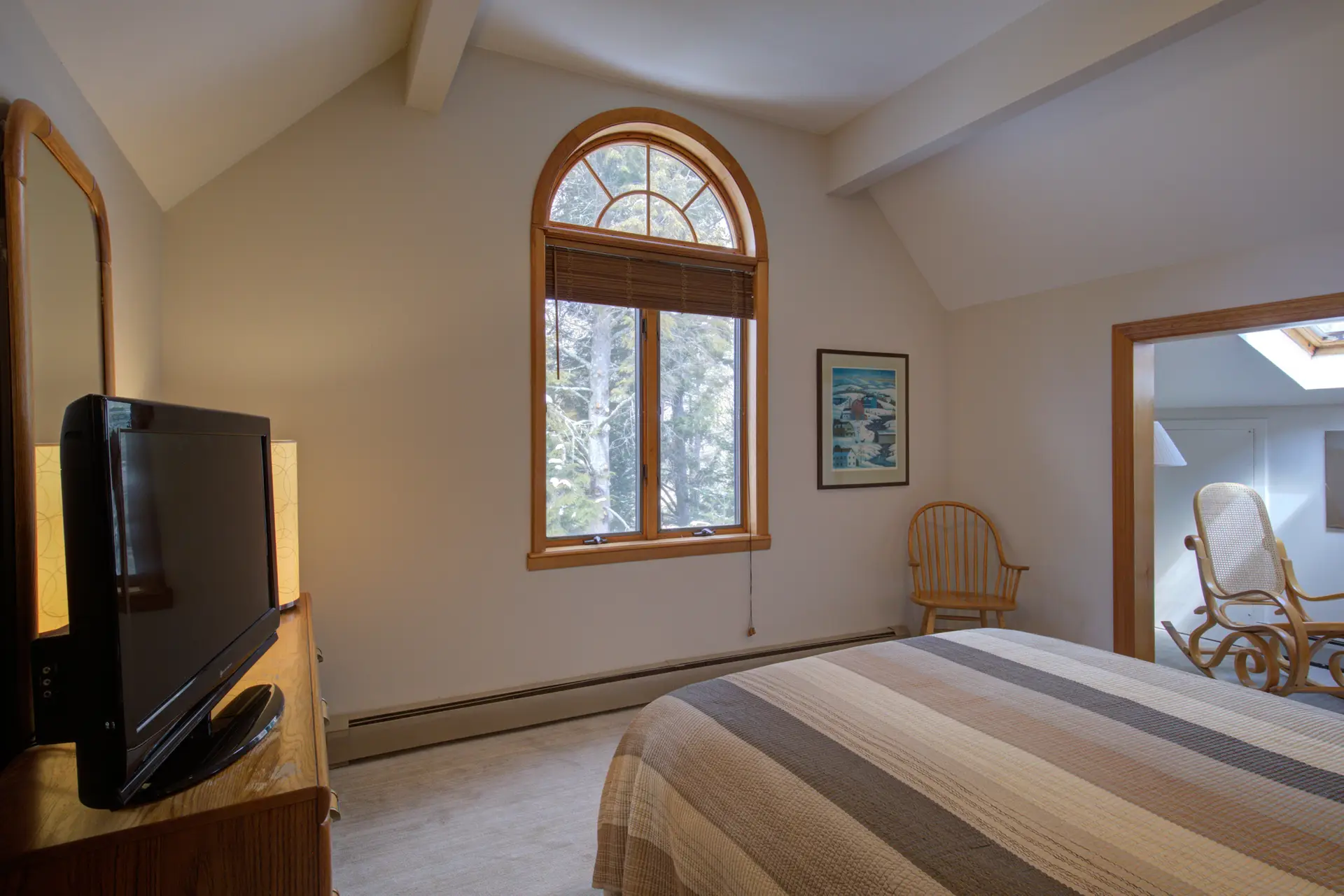 The main floor of our Stowe winter ski season rental home includes two comfy sofas centered on the wood burning fireplace, a corner desk, a generous reading chair at the window, a puzzle/card table, a corner bar, and a dining table that seats 8. The Lodge’s winter holiday kitchen has been updated with all new appliances including double ovens and a 5 burner stove and is fully stocked with cooking and baking tools and utensils. A laundry room is located just off the kitchen. The main floor also includes a King Bedroom Suite with a walk-in closet and bath with a tub and shower. Another bath with shower is located at the entry.