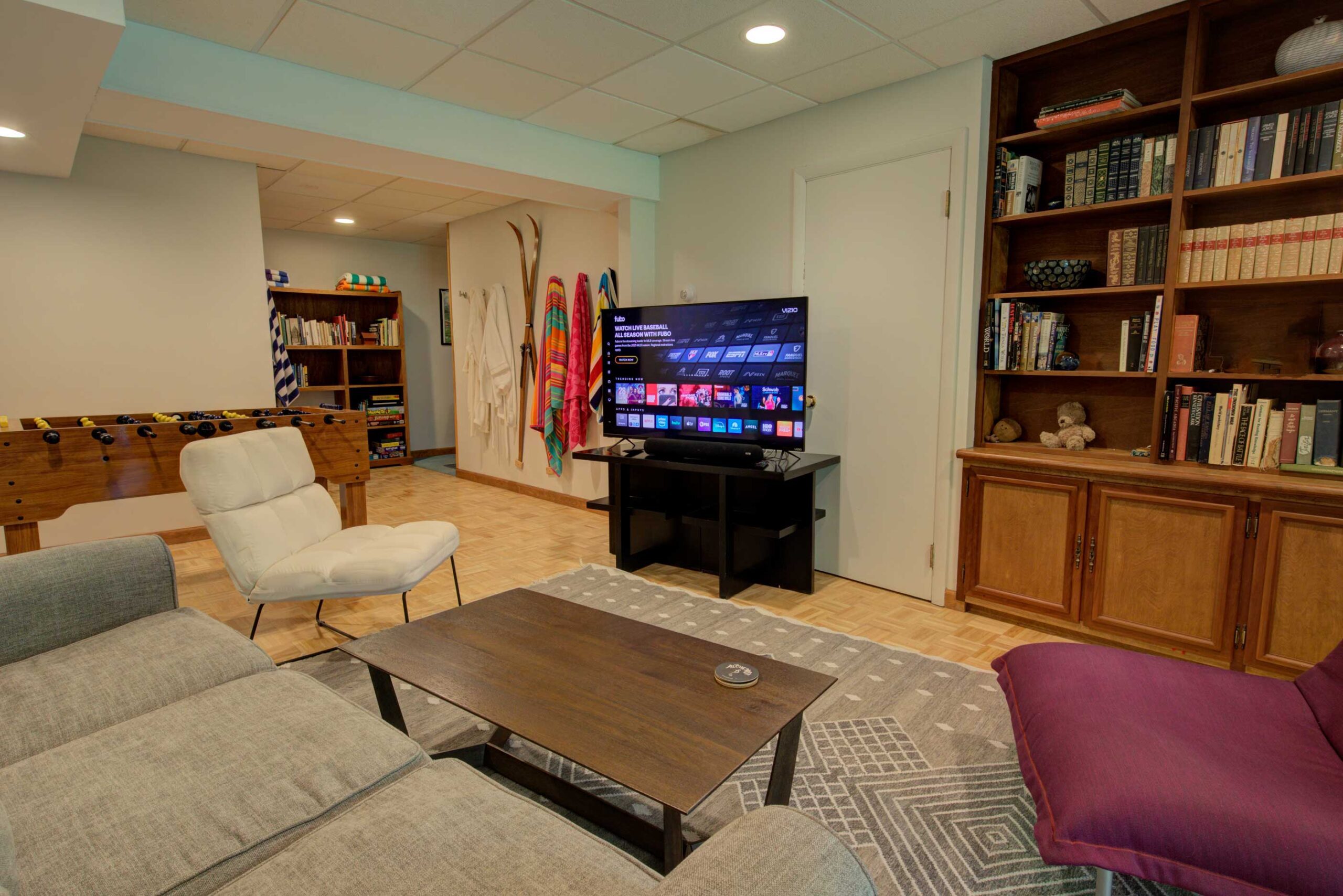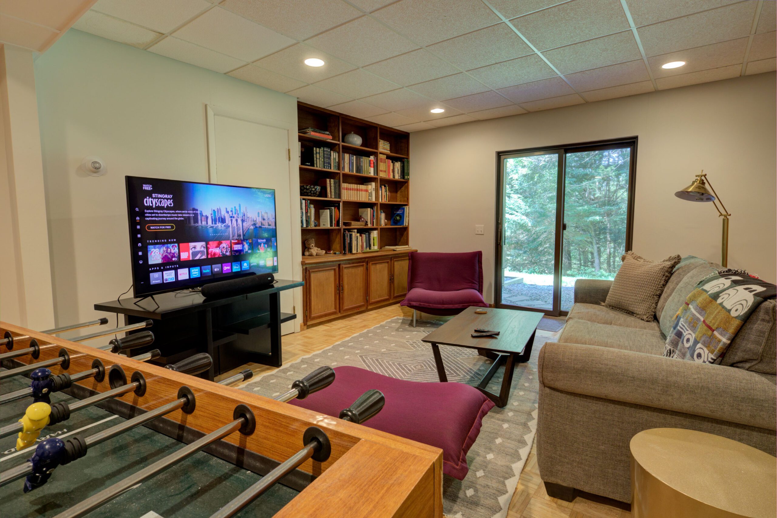 The lower level is a great getaway, especially for the kids to escape to their own room. It includes a game room with a large TV, foosball table, lots of board games and puzzles, a sleeper sofa, a bath with a large shower. Step outside the glass doors to the 6 person hot tub. The lower level bedroom offers 2 twin beds and double closet.